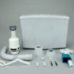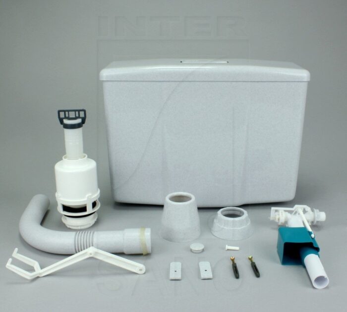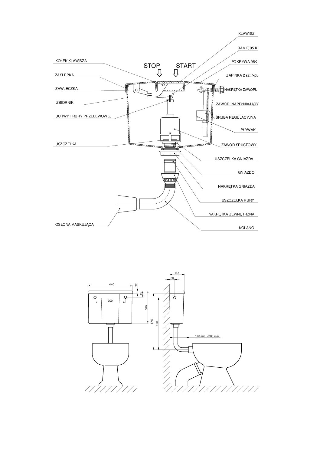 Spłuczka 95K wykonana jest z polipropylenu. Model ten jest nisko zawieszony, wyposażony w klawisz Start-Stop, który umożliwia kontrolę ilości spłukiwanej wody. W komplecie dołączone regulowane kolano dolnopłuka.