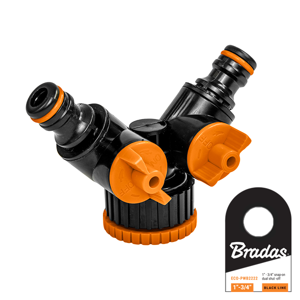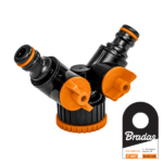Trójnik (adaptor) do kranu 3/4″ z redukcją na 1″ z dwoma niezależnymi i regulowanymi zaworami do podłączenia dwóch linii nawadniających.
